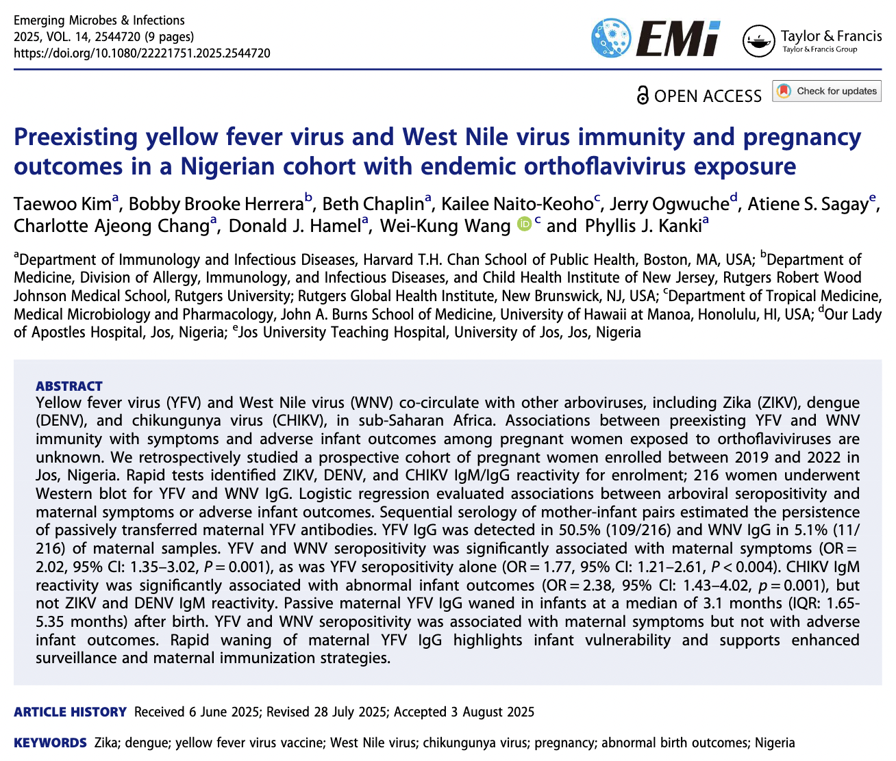 Kim TW, Herrera BB, Chaplin B, Keoho KN, Ogwuche J, Sagay AS, Chang CA, Wang WK, Kanki PJ. Preexisting yellow fever virus and West Nile virus immunity and pregnancy outcomes in a Nigerian cohort with endemic Orthoflavivirus exposure. Emerging Microbes and Infection. 2025.